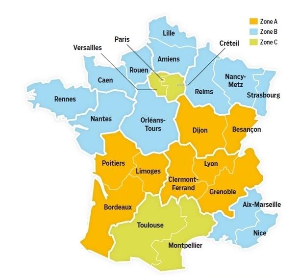 O dia escolar na França é das 8:30 às 16:30, mas varia dependendo da área em que você mora, como você pode ver no mapa escolar da França. Isto é mais longo que o típico dia de escola no Reino Unido ou nos Estados Unidos, mas há um intervalo mais longo para o almoço e dois outros intervalos durante o dia. Há 24 horas de aulas por semana. A maioria das escolas primárias e secundárias francesas, assim como um grande número de universidades, são instituições públicas que têm administrações altamente centralizadas.